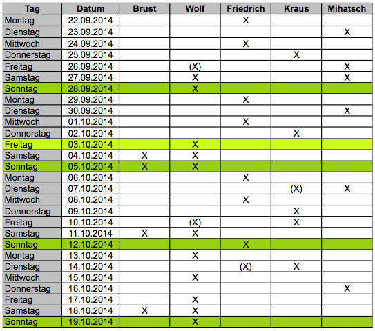 Terminplan der Keltermeister von Montag, den 22.09.2014 bis Sonntag, den 19.10.2014.